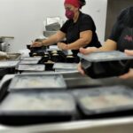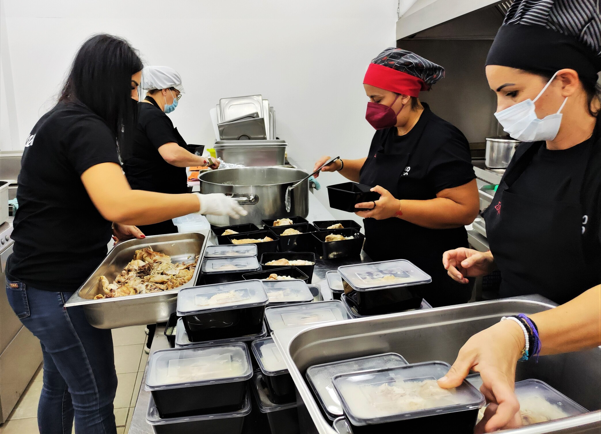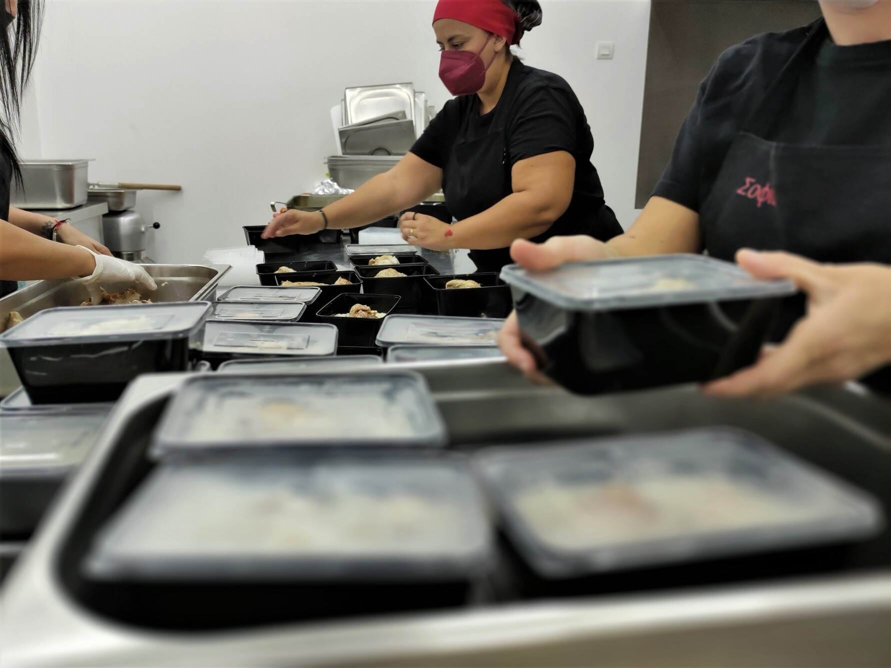 Οι εργαζόμενοι του ΔΟΚΑΠΠΑΜ ετοίμασαν το φαγητό το οποίο συσκευάστηκε σε μερίδες και παραδόθηκε στο συντονιστικό κέντρο που έχει στηθεί στο Εκθεσιακό Κέντρο στο Αρκαλοχώρι.