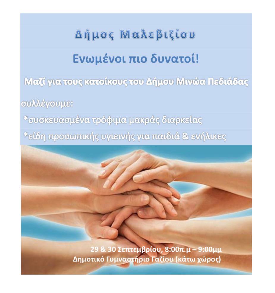 Όσοι πολίτες, σύλλογοι, σωματεία και επιχειρήσεις επιθυμούν να προσφέρουν μπορούν να προσέρχονται από τις 8 το πρωί έως και τις 9 το βράδυ στον κάτω χώρο του Δημοτικού Γυμναστηρίου στο Γάζι σήμερα Πέμπτη και αύριο Παρασκευή 1 Οκτωβρίου.