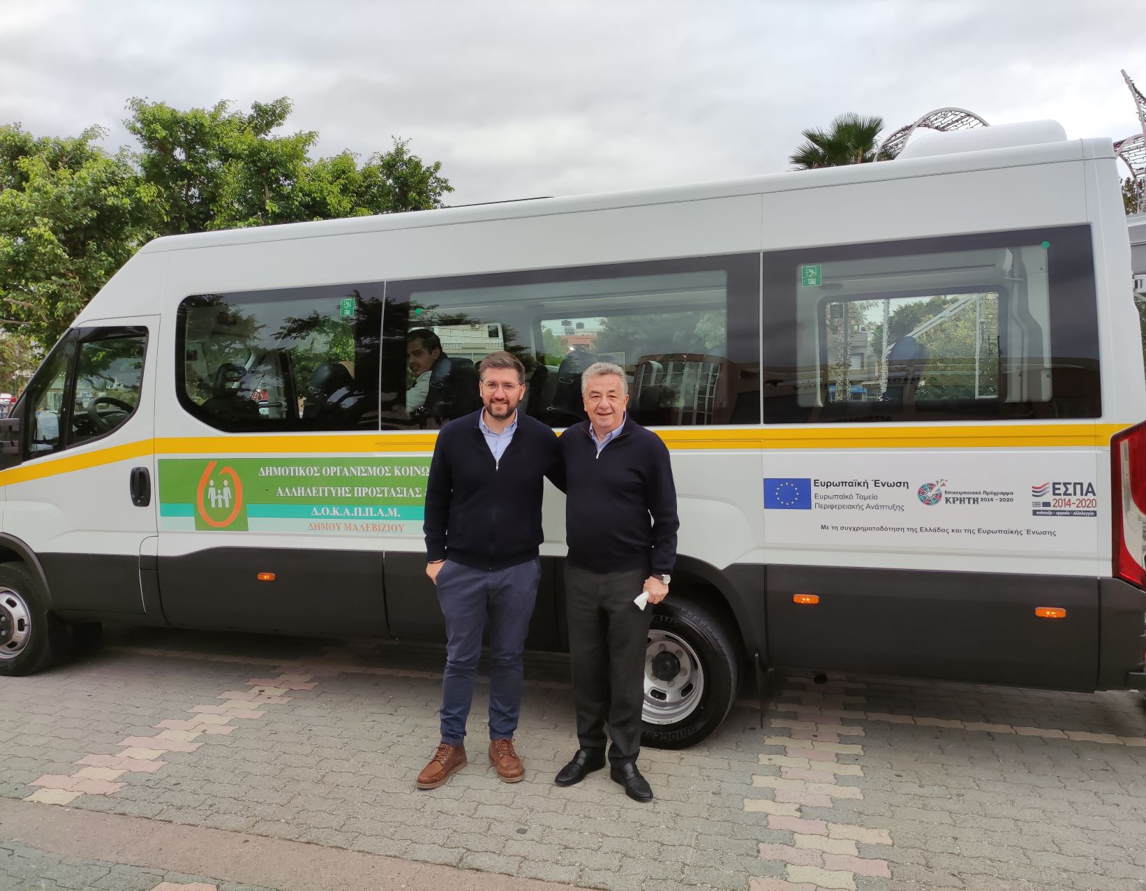Το νέο λεωφορείο 14 θέσεων είναι προσαρμοσμένο στις ανάγκες μεταφοράς παιδιών με αναπηρίες ενώ διαθέτει και ράμπα για την μεταφορά αμαξιδίων. Το κόστος προμήθειας του λεωφορείου ανήλθε στις 105.000 ευρώ και η χρηματοδότηση του έγινε από το ΕΣΠΑ μέσω του ΠΕΠ της Περιφέρειας Κρήτης με το Μενέλαο Μποκέα να ευχαριστεί το Σταύρο Αρναουτάκη για τη στήριξη του στο Μαλεβίζι.
